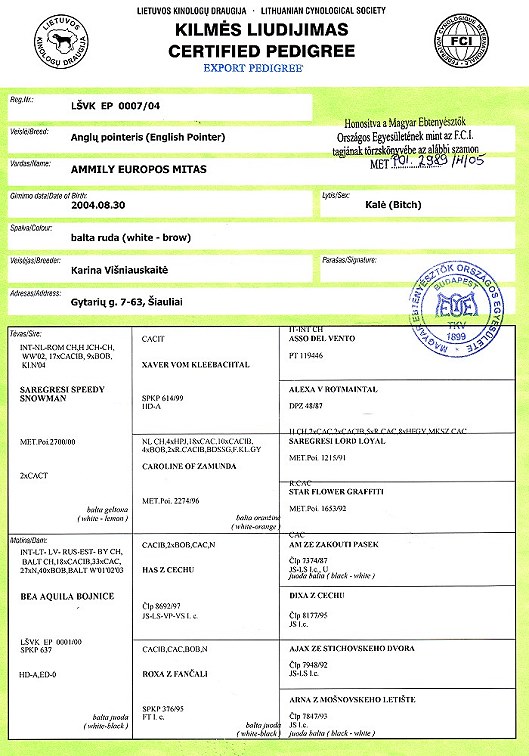 Mikor 2004. januárjában elment örökre imádott Cindykénk, egy kutyánk maradt csak, Fedra, aki már akkor is 10 és fél éves volt. Depressziós lett anyja elvesztésétől, nekünk is nagyon hiányzott, hogy még egy kutyánk legyen, így nyáron már mindent elkövettünk, hogy találjunk egy pointer kölyköt. Más fajta szóba sem jöhetett, mivel 20 éves pointer-imádat és tartás állt mögöttünk. De az országban akkor sehol nem sikerült eladó alom nyomára bukkannunk, reményünk pedig, hogy barna foltosat találjunk, mint Cindy és első kutyánk, Anka, szinte teljesen elveszett. Október eleje táján a honlapon megláttam Gyárfás Marianne Speedyjének Litvániában született kölykeiről készült fényképét, és örömmel láttuk, hogy barna foltos kiskutyák is vannak közöttük. Azonnal írtam az anyakutya tulajdonosának, akivel e-mailezésbe kezdtünk. Angol nyelven folyt a levelezés, ez kissé korlátokat szabott főleg az én kifejezőképességemnek, de mégis sikerült kölcsönös szimpátiát ébresztenünk egymásban. A kölykök tenyésztője, Karina megírta, hogy egyetlen barna foltos kislány van, Ammily, és küldött róla képet. Rögtön beleszerettem, férjem és fiam szintén el voltak ragadtatva a 4 hetes kölyökkutya bájától. Ezután tudtam, senki más nem kell nekem, csak Ammily. Miután több jelentkező közül Karina a távolság ellenére is minket választott, végre el mertük hinni, hogy újra lesz egy barna foltos pointer kislányunk. Igen ám, de Litvánia tényleg elég messze van, és nem nagyon volt rá módunk, hogy kiutazzunk érte. Mindenképpen olyan lehetőséget kerestünk az idejutására, ami nem viseli meg túlzottan a fiatal kiskutyát. Karina talált végül is megoldást. Egyik jó barátja kamionosként Magyarországra kapott fuvart, ő hozta el hozzánk Ammily Europos Mitas-t, a 7 hetes kölyökkutyát. Napokon át vártuk türelmetlenül a hírt, mikor indulnak el, és végre október 20-án eljött a várva várt nap. Ammily megérkezett. A hosszú úttól elalélt kicsi pár percen belül teljesen magához tért és össze-vissza ugrált és nyalt minket a kocsiban hazafelé, mert otthonunktól elég messze, a tornyosnémeti határátkelőhelyen szoríthattuk őt először karjainkba. Fedra itthon találkozhatott vele először, és éppen azokban a napokban történő műtétje ellenére nagyon örült neki. Azonnal a pártfogásába vette a kis apróságot, pedig az sokszor erőszakosan harapdálta őt éles fogaival játék közben, mégsem haragudott meg rá soha azután sem, rá se mordult, és korát meghazudtoló élénkséggel vetette bele magát a játékba fogadott kisbabájával. Azután is ( Fedra élete utolsó pillanatáig) nagyon ragaszkodtak egymáshoz. Fedra egészen megfiatalodott Ammily mellett. Nyolc almot neveltünk fel az elmúlt 20 év alatt, három kutyánk öregedett meg mellettünk, de Ammily mindegyiktől különbözött már bébinek is, és most is. Irtó élénk, energikus, soha sem fárad el, határozott és öntörvényű, kissé különc, magának való és bájosan erőszakos.Imádja a vizet, az úszást. Kitartó, amit a fejébe vesz, mindenképp megpróbálja véghez vinni. Borzasztóan kíváncsi, mindent fel akar fedezni, meg akar ismerni, mindent megszimatol, a szájába vesz. A kutyákkal is, emberekkel is barátságosan viselkedik. Kedves, hízelgő, rendkívül értelmes és tanulékony. Ragaszkodó, nagyon kötődik hozzánk, a családhoz, "szertartásai" vannak a reggeli, vagy hazaérkezésünk utáni köszöntéseinek. Ammily nemcsak jellemileg különleges, de kifejezetten elegáns és szép kutya is, amit a kiállítási eredményei is bizonyítanak.........2017.október 13. AMMILY ELMENT! Drága, édes, imádott Hercegnőnk... Különleges, és csodálatos volt. Kedves, és magának való, hízelgő és mogorva, ragaszkodó, öntörvényű, bájosan erőszakos, bátor, semmitől sem félt, soha nem ölt meg semmilyen élőlényt. Sok kedves és egyedi szokása volt, 6 nap híján 13 évet volt velünk, ez nagyon sok és mégis borzasztóan kevés... Végletekig bízott bennünk, bármilyen kellemetlen dolgot tehettünk vele, tudta, hogy érte van. Majdnem mindent megértett. Még nem tudom felfogni, hogy nem ölelhetem többé magamhoz, hogy nem dől nekem, nem bújik a lábunk közé, nem kunyerál kaját, nem bújik össze a többiekkel. Nagyon üres a ház és az egész világ! |